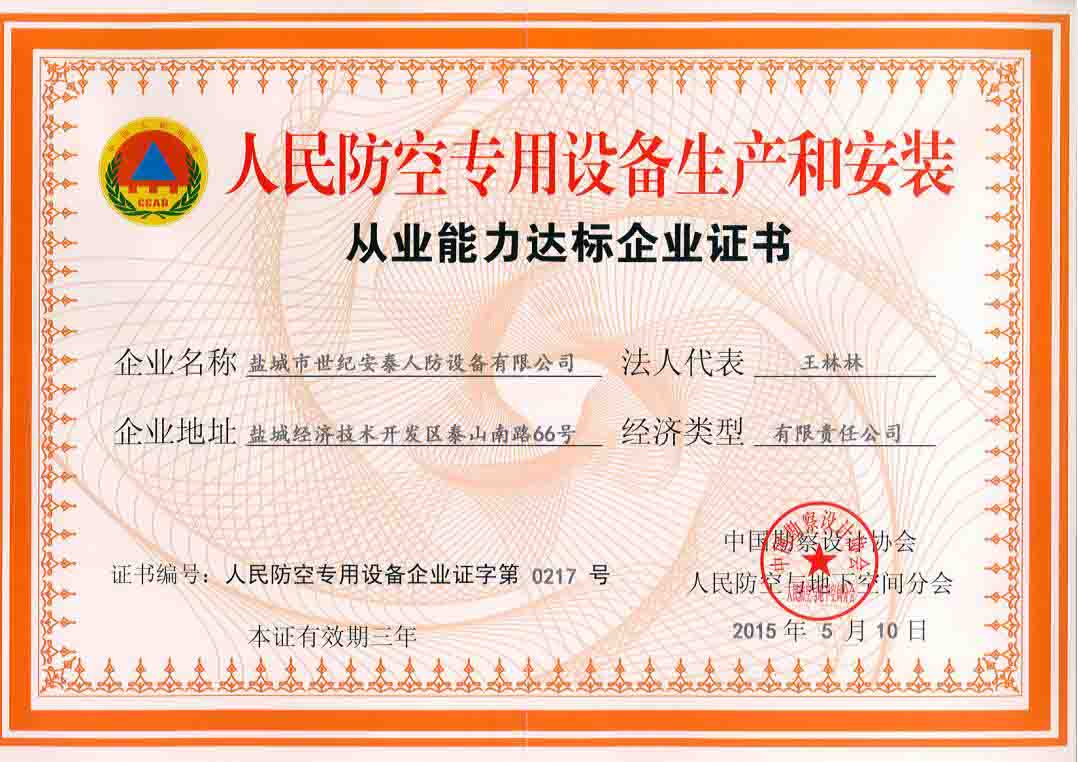 鹽城市世紀(jì)安泰人防設(shè)備有限公司是國(guó)家人民防空辦公室批準(zhǔn)成立的人防工程防護(hù)設(shè)備定點(diǎn)生產(chǎn)和安裝企業(yè),是專業(yè)生產(chǎn)、銷售、安裝人防防護(hù)設(shè)備產(chǎn)品的企業(yè),公司主要生產(chǎn)鋼筋混凝土防護(hù)設(shè)備、鋼結(jié)構(gòu)手動(dòng)防護(hù)設(shè)備、閥門、電控門、防電磁脈沖門、地鐵和隧道正線防護(hù)密閉門等各類產(chǎn)品并對(duì)產(chǎn)品進(jìn)行安裝、調(diào)試、維修及保養(yǎng),公司生產(chǎn)的各種規(guī)格的人防工程產(chǎn)品,均按國(guó)家人防總參工程兵四所及中國(guó)建筑標(biāo)準(zhǔn)設(shè)計(jì)研究院提供的圖紙生產(chǎn),符合各種人防工程設(shè)計(jì)要求,是各類地下人防工程選用的理想產(chǎn)品。本公司已通過(guò)GB/T19001-2008IDT ISO9001:2008國(guó)家質(zhì)量體系認(rèn)證。